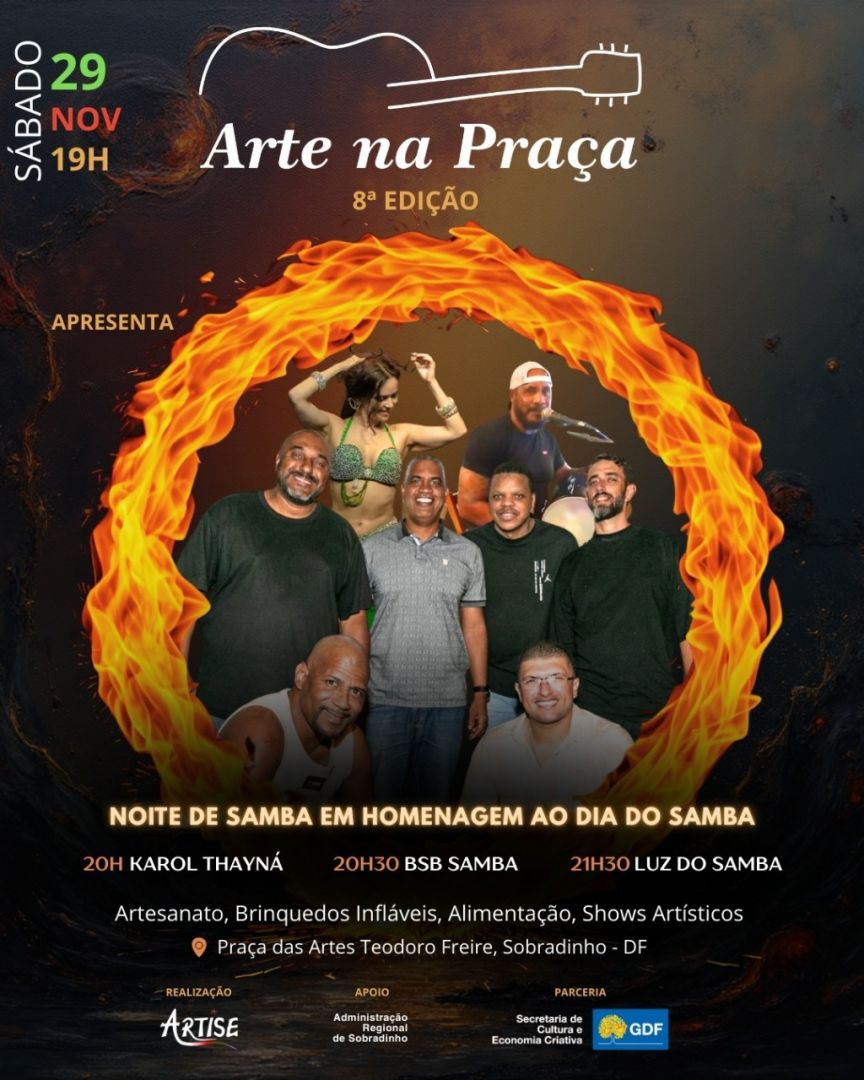 Às 19h o grupo BSB Samba inicia a noite. Apesar de sua formação recente, o grupo se destaca pela diversidade de seu repertório, que inclui samba, MPB, axé e rock, buscando conquistar um público cada vez maior. Já a principal atração da noite, o Grupo Luz do Samba, sobe ao palco às 21h. Considerado um dos patrimônios artísticos de Sobradinho, o Luz do Samba faz sucesso desde 1988 e apresentará grandes sucessos e composições autorais. No intervalo dos shows, a bailarina Karol Thayná, atração especial e permanente do Projeto, apresentará seu show de dança do ventre, que promete seduzir e surpreender o público com a excelência de seus números.