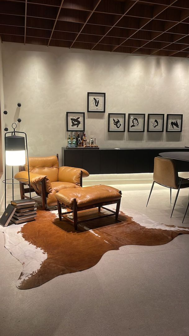 Segundo Juliana Oliveira, a metragem de 45m² do espaço, abriga a essência da cultura brasileira, com o teto de muxarabi em madeira que remete à tradição e artesanato. A paleta de cores, destacando a elegância do preto e a autenticidade de elementos naturais como pedra e couro, se une para criar uma atmosfera acolhedora e sofisticada. A iluminação minuciosamente planejada realça cada detalhe do ambiente, estimulando o bem-estar e a criatividade durante o trabalho.