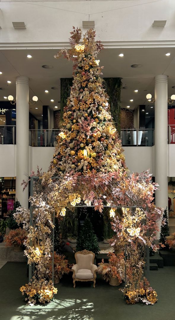 Assinada por Mabel Manzi Decor, a cenografia deste ano adota uma estética voltada para nuances terrosas, dourado suave e texturas que evocam a natureza. O espaço central é ocupado por borboletas iluminadas em diferentes proporções, que criam uma composição visual leve, orgânica e contemplativa. A proposta privilegia o olhar artístico: o foco na precisão de cada elemento, convidando o visitante a observar a decoração como uma instalação que sensibiliza e desperta memórias afetivas.