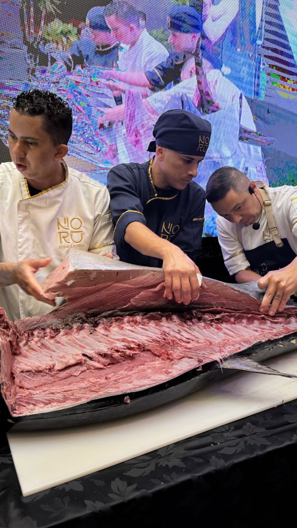 O chef Bruno Kamakura comanda a equipe de operação de abertura do bluefin com aproximadamente 100 quilos. O peixe azul mexicano, o mais caro do mundo, é da empresa Bluefiná, que o cultiva com uma dieta oceânica natural, a base de anchovas e sardinhas, o que resulta em uma carne saborosa e docemente amanteigada, que derrete na boca.