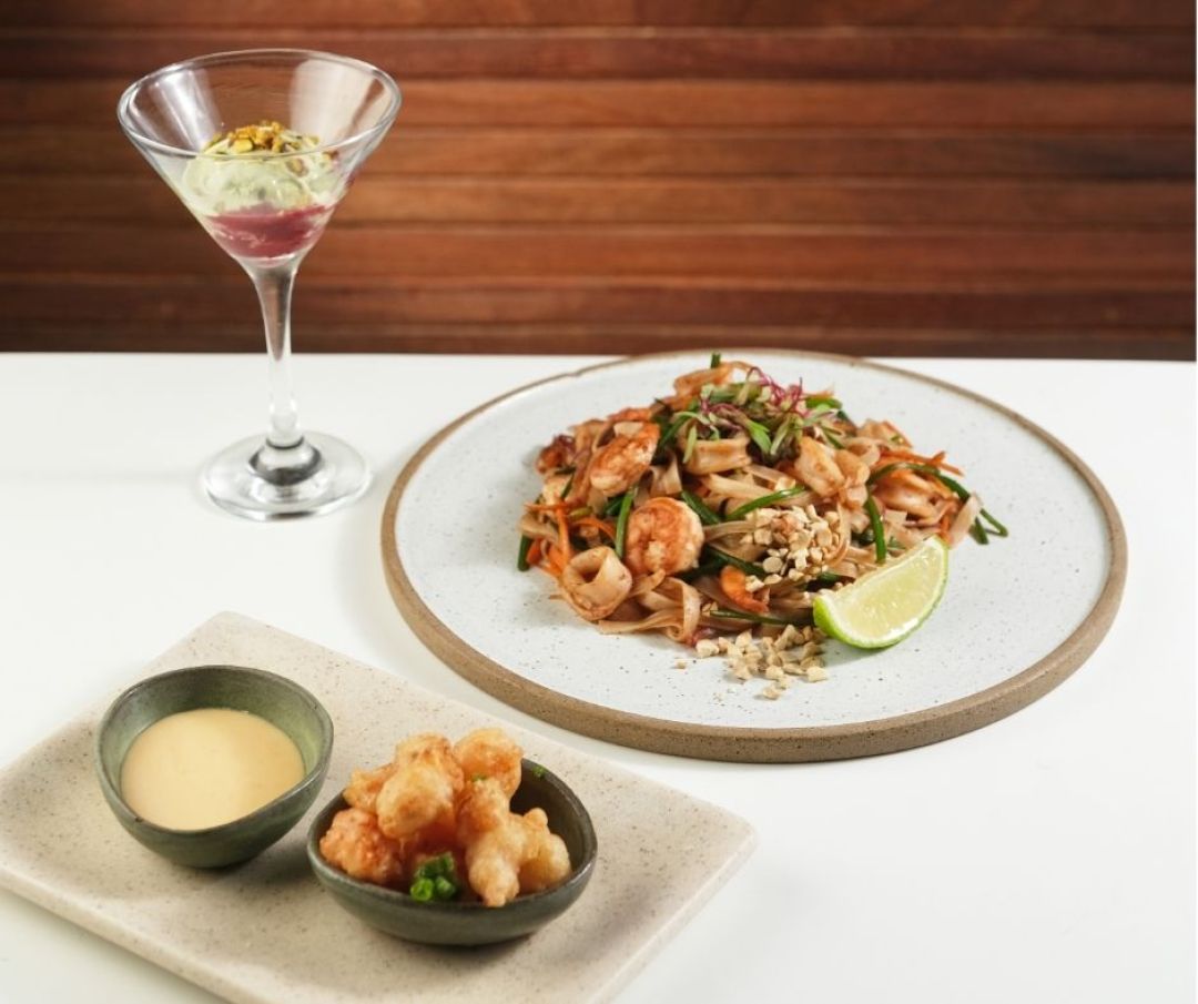 Já o Menu 2 oferece três alternativas principais: o combinado do chef com 12 peças de sushi assinadas, o combinado tradicional com cortes clássicos e o lombo de salmão com pele na manteiga de nirá, servido sobre bok choy e shiitake, acompanhado de risoto ao curry. Há ainda a opção de pad thai com camarão e lula — ou na versão vegetariana com tofu defumado — finalizado com castanhas crocantes e molho thai.