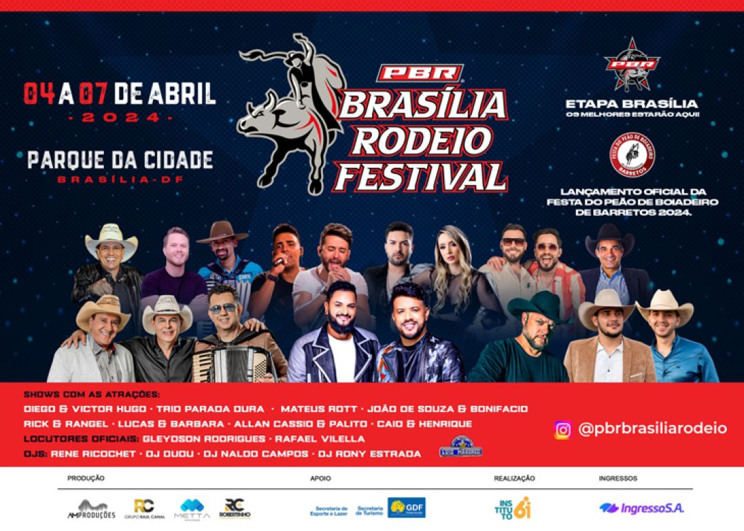 O PBR Brasília Rodeio Festival acontecerá no estacionamento 9 do Parque da Cidade e tem como objetivo se tornar uma das referências da Capital Federal com diversas atrações dentro e fora da arena. Realizado pelo Instituto 61 e produzido em parceria pela AM Produções, Grupo Raul Canal, Metta Comunicação e Robertinho Produções & Eventos, o evento tem apoio do Governo do Distrito Federal.