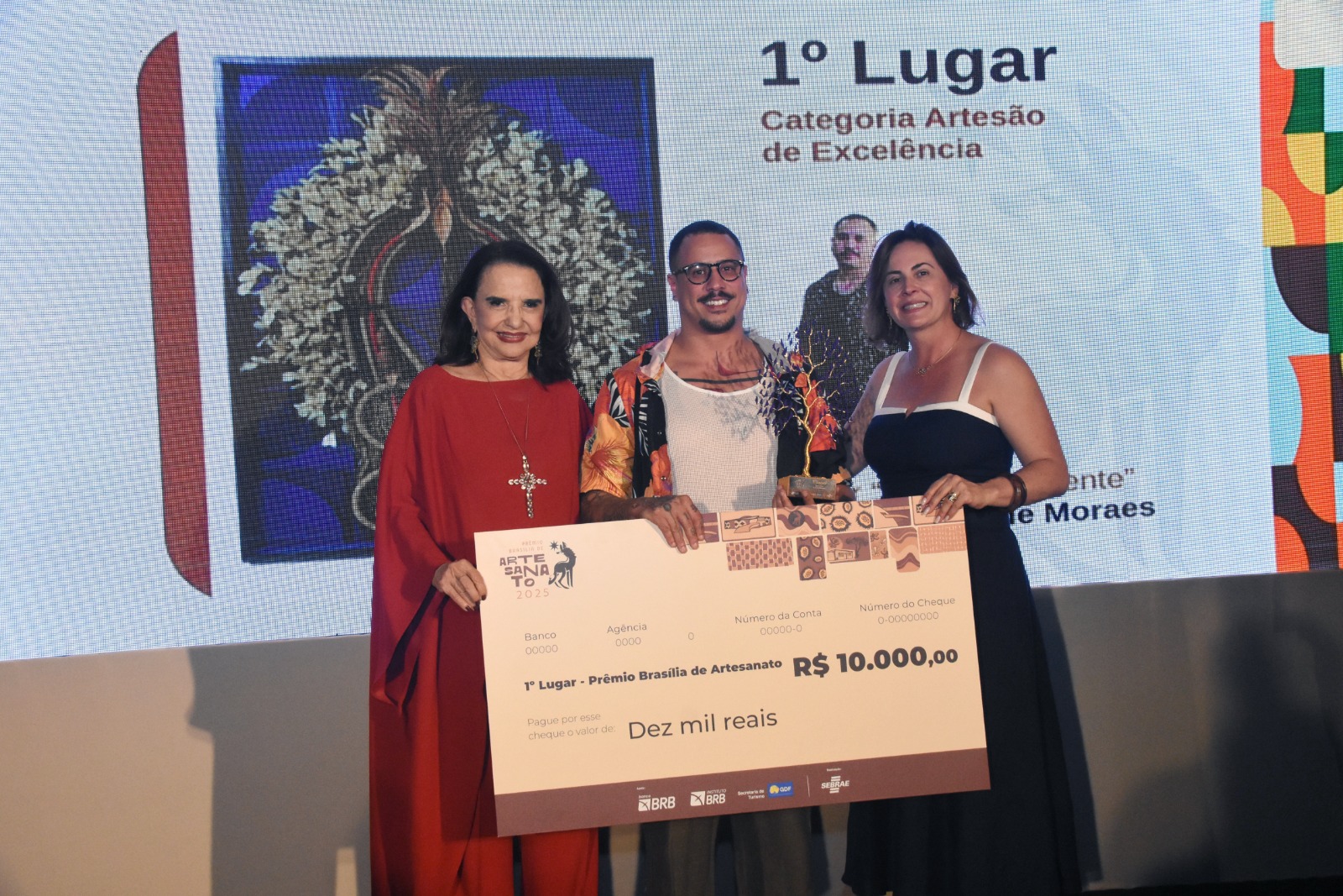 Em seguida, foi o momento de conhecer os três artesãos mais bem colocados na categoria Artesão de Excelência, que busca reconhecer profissionais cujo trabalho se destaca pela excelência técnica e pela contribuição para a valorização do artesanato no Distrito Federal. Bianca Barbosa Santana Nascimento, de Águas Claras, e Mariana Nunes de Oliveira Damasceno, de Sobradinho, ocuparam o terceiro e o segundo lugar, enquanto João Vinícius de Moraes Nascimento, artesão do Gama, ficou com a primeira colocação.