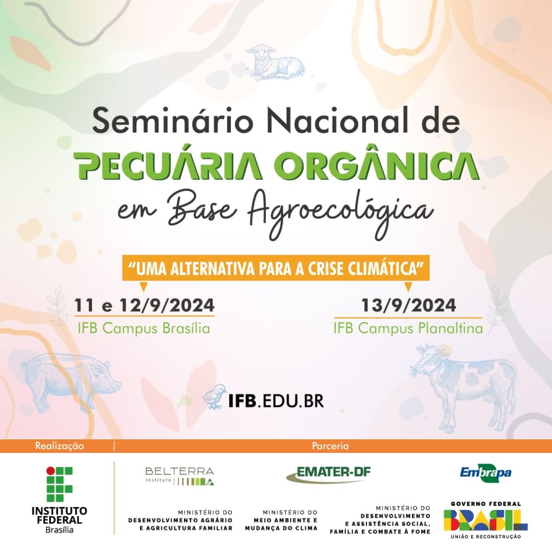 Uma das alternativas para diminuir o impacto da crise ambiental causada por mudanças climáticas é a pecuária orgânica. De olho no potencial de crescimento dessa prática, o Instituto Federal de Brasília (IFB) sediará o Seminário Nacional de Pecuária Orgânica e de Base Agroecológica. O evento ocorre, na quarta (11/9) e quinta-feira (12/9), no IFB Campus Brasília. Já para sexta (13), está marcado um dia de campo no IFB Campus Planaltina.