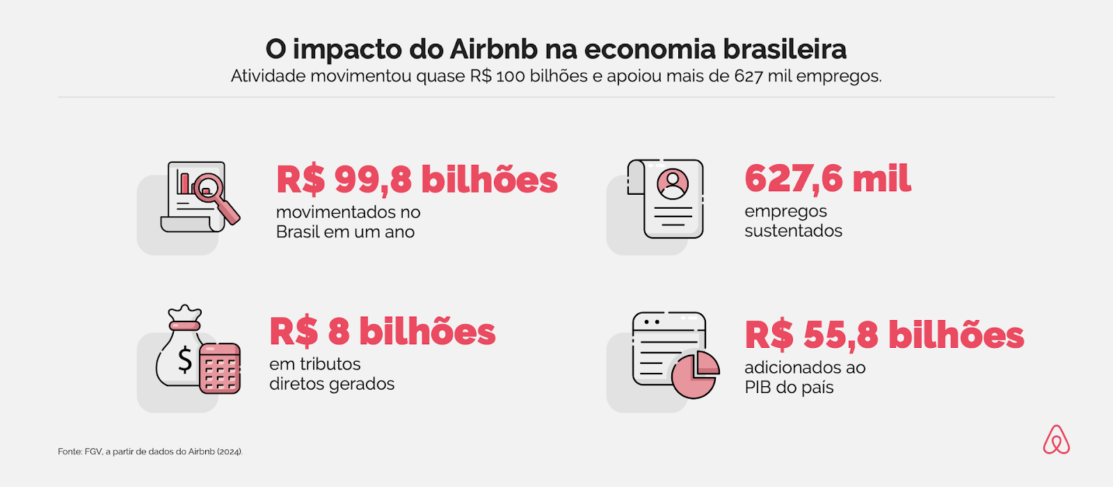 Em 2024, o Airbnb impulsionou o movimento de R$ 99,8 bilhões na economia brasileira, sustentando 627,6 mil empregos e gerando R$ 8 bilhões em tributos diretos. Além disso, a atividade realizada via plataforma contribuiu com R$ 55,8 bilhões para o PIB do Brasil.