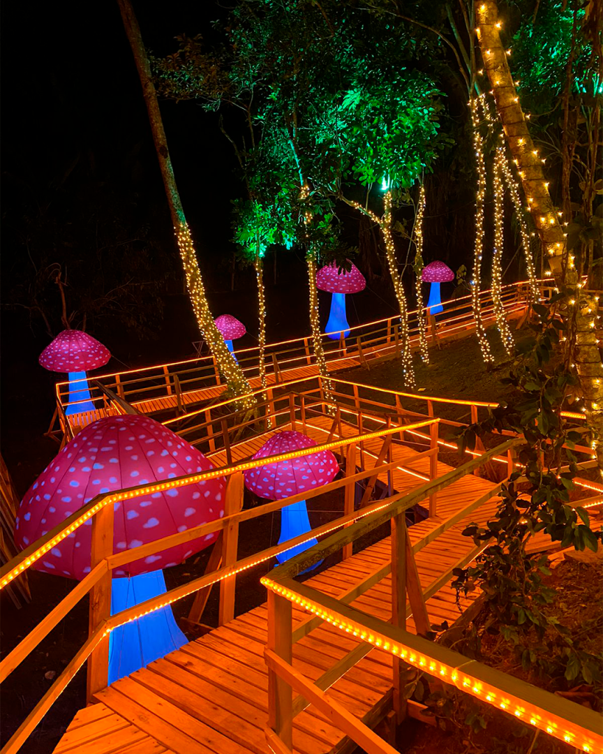 Instalado em uma área de 4.400 m², em Taguatinga, o Vale Encantado Brasília contará com 1.500 m² dedicados à cenografia, criando um ambiente que combina espécies vegetais reais e iluminação técnica de alta precisão. São 150 árvores mapeadas de diferentes espécies, como ipês, pau-brasil, jatobás, guapuruvus e araucárias, além de 10 mil flores iluminadas e microlâmpadas que darão vida ao espaço.